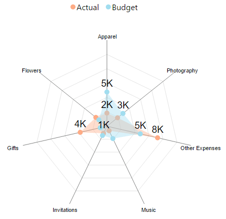 The distance from the center displays the value of the score in the given category.